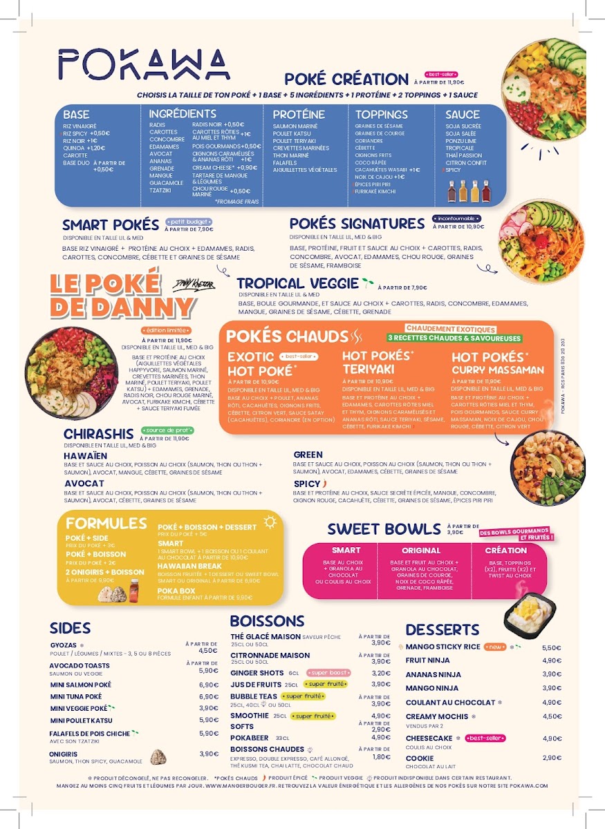 The menu also includes diverse sides such as chicken, vegetable, or mixed gyozas, avocado toasts, falafel with tzatziki, and mini poké bowls featuring salmon, tuna, or veggie options. Convenient meal formulas enhance the experience, from simple poké bowl combos with sides or drinks to kid-friendly POKA BOX offerings.